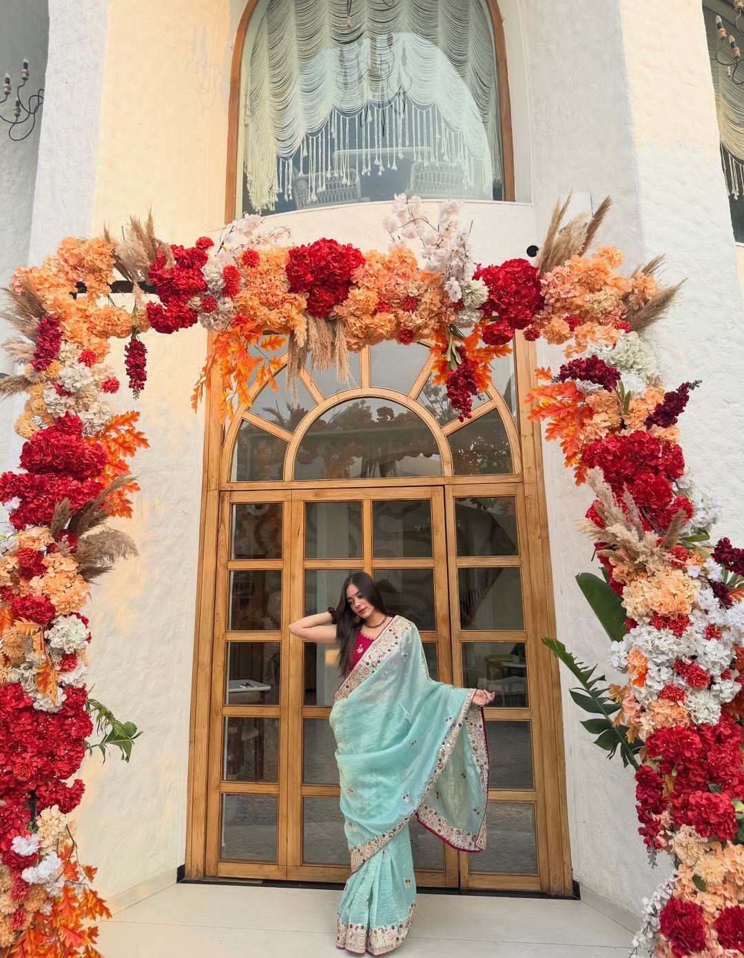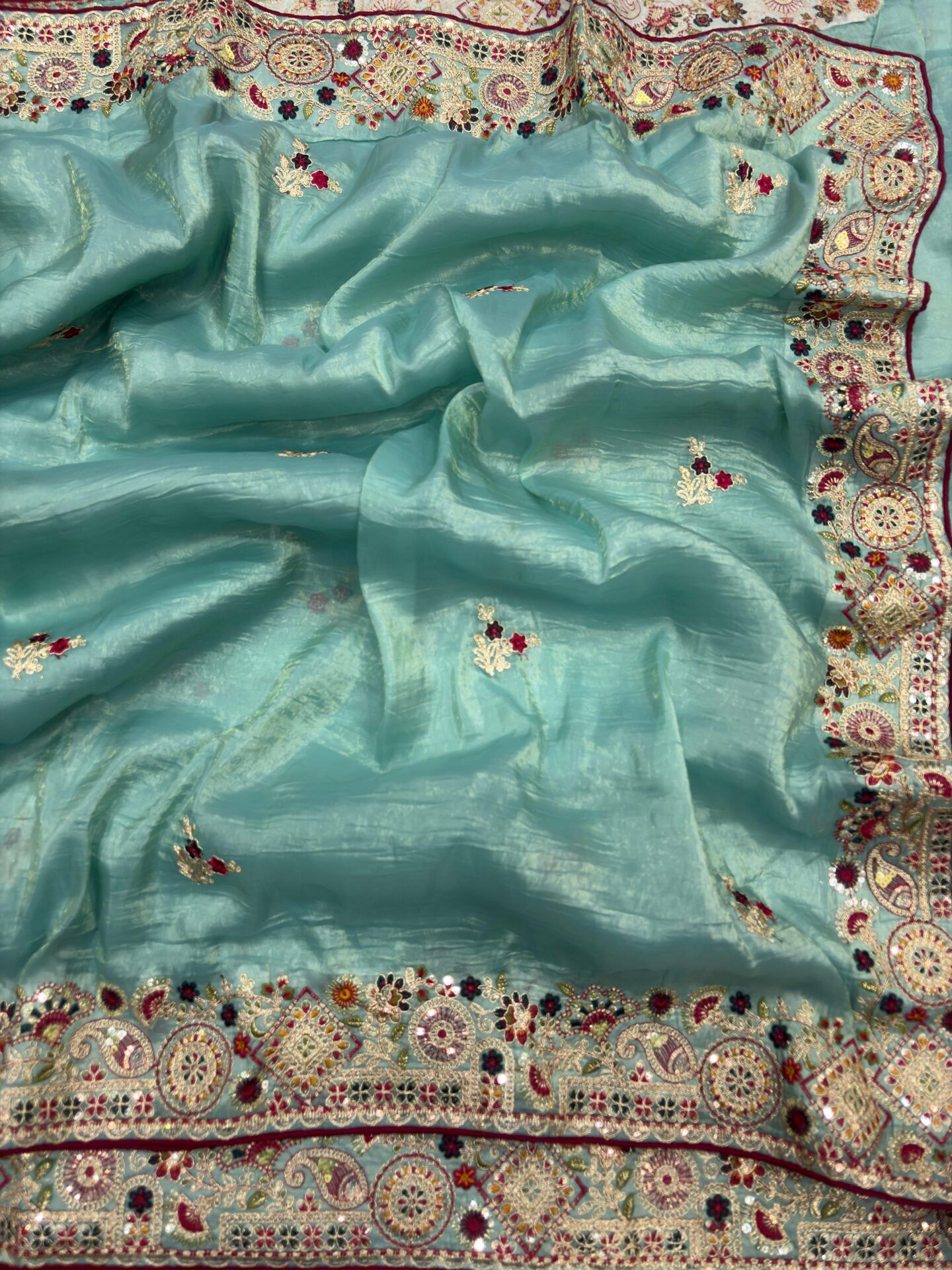 • Embroidery: Multi-thread embroidery with all-over butta work