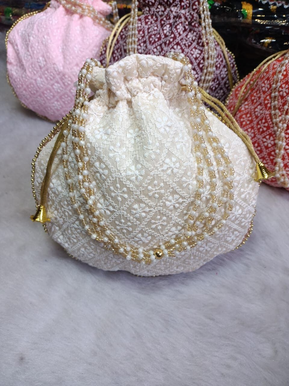 Festive Chikankari potli bag with beaded handles, size 9”×9”. High quality, made in India.