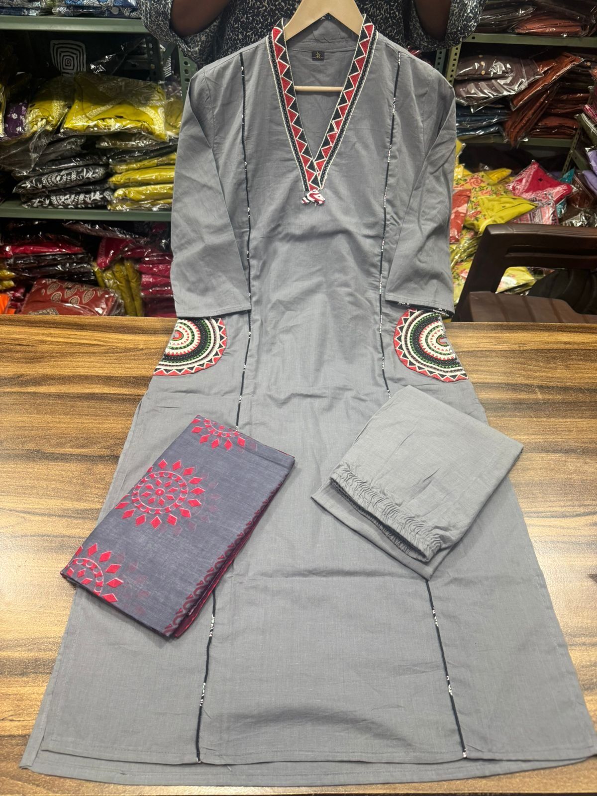 Heavy Cotton Kurti Set with Sequins | 3-Piece Kurta Pant Dupatta